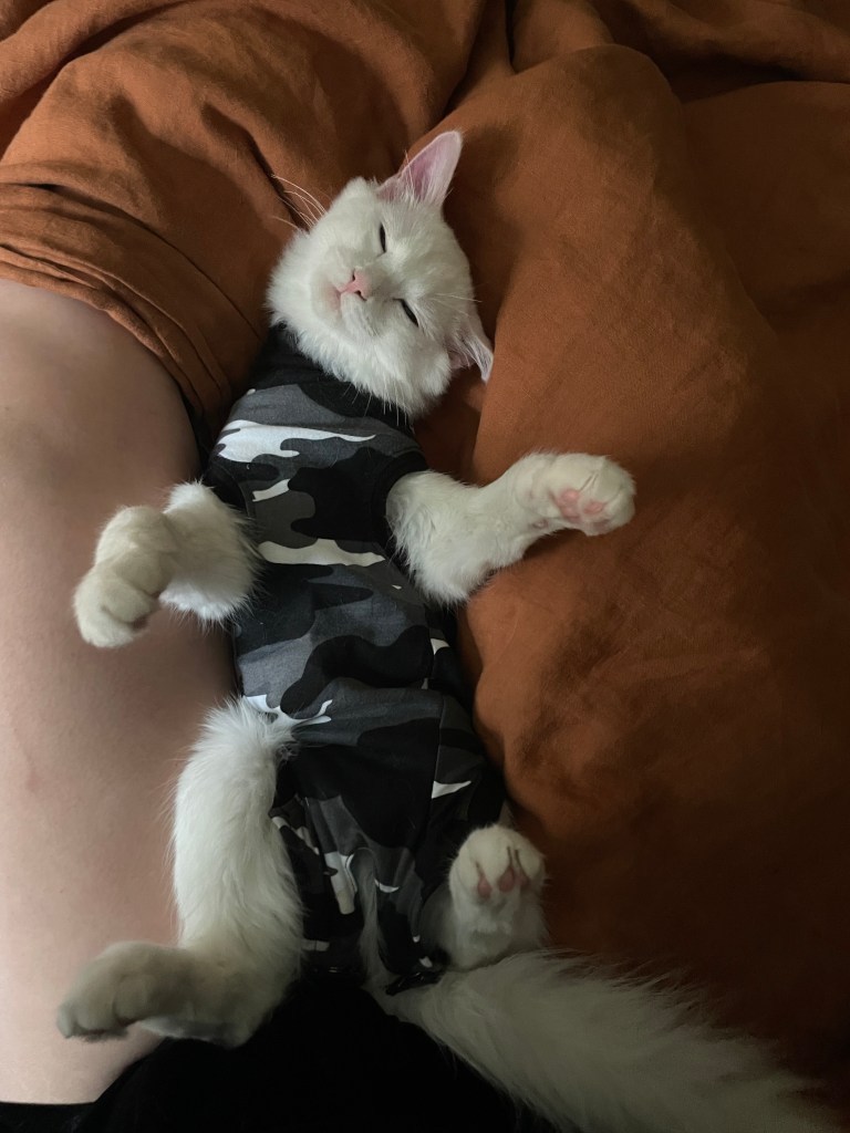 Through a series of recent developments I’ve welcomed two additional feline friends into my home and while they are both male to my male and female couple, the biggest difference is that the white boy who has come to live with me is just a wee 5 months old (and was recently neutered which is why he’s pictured here wearing his surgical suit) compared to the others, who are between 1.5 and 2.5 years old and who all weigh twice what he does!